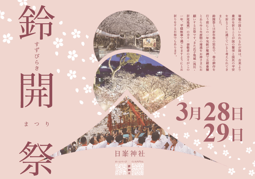 鈴開祭(すずびらきまつり)とは祈念祭の別名で、春の耕作を行う前にこの一年気候が順調で五穀豊穣とあらゆる生産物の増進をお神さまにお願いすると共に、人々がこの一年平穏無事で過ごせますようにとお祈りをするお祭りでもあります。