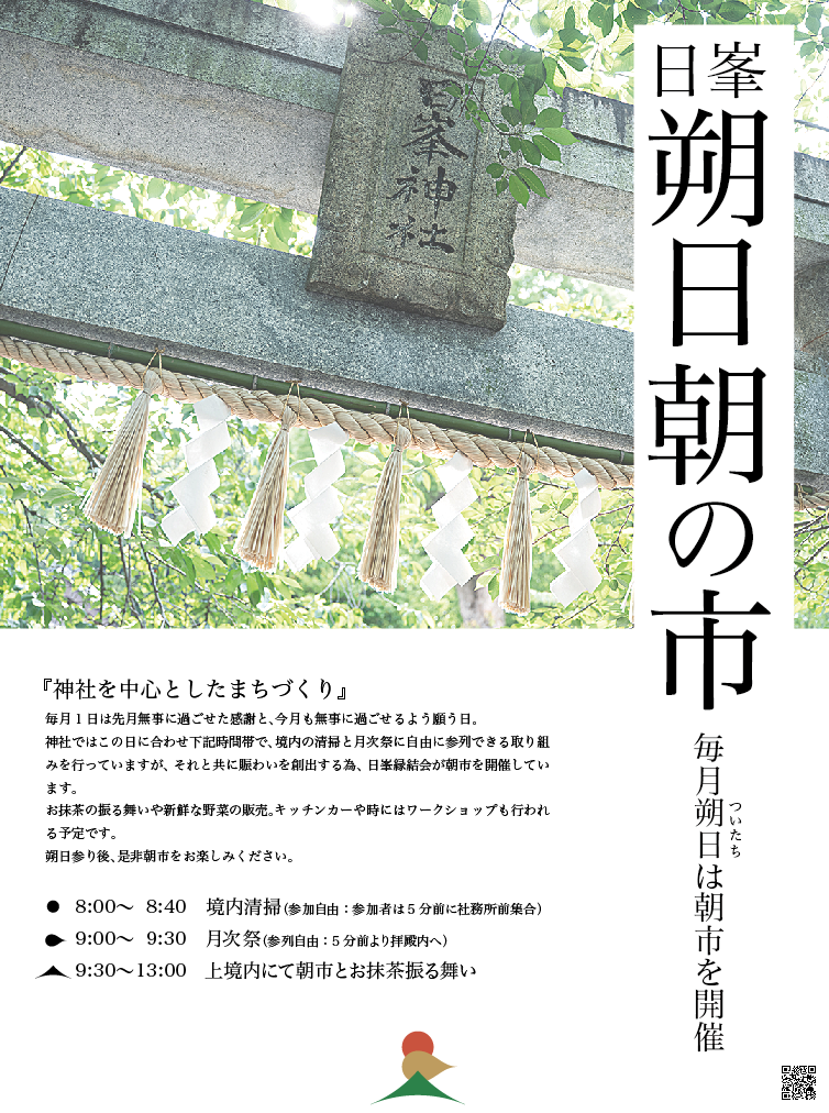 日峯神社ではこの日に合わせ、下記時間帯で境内の清掃と月次祭に自由に参列できる取り組みを行っていますが、それと共に賑わいを創出する為、3月より日峯縁結会が朝市を開催いたします。