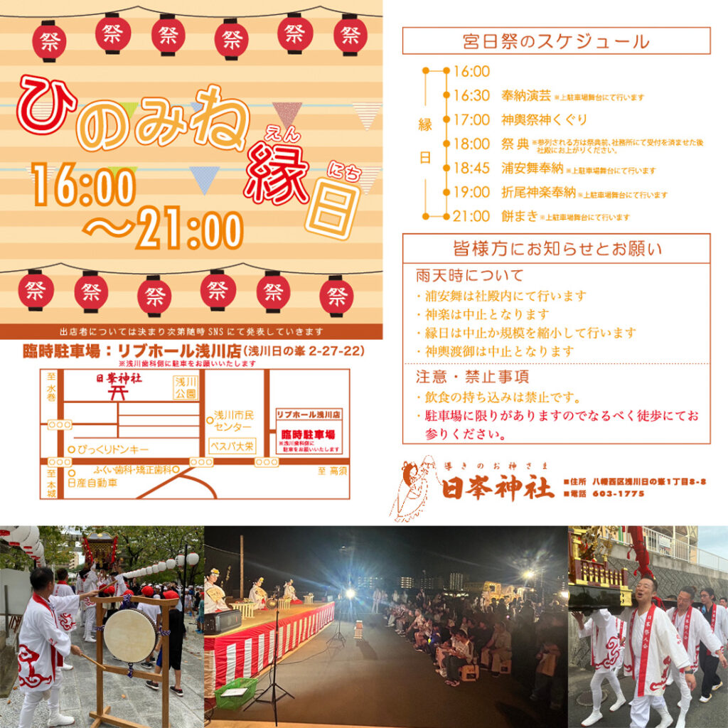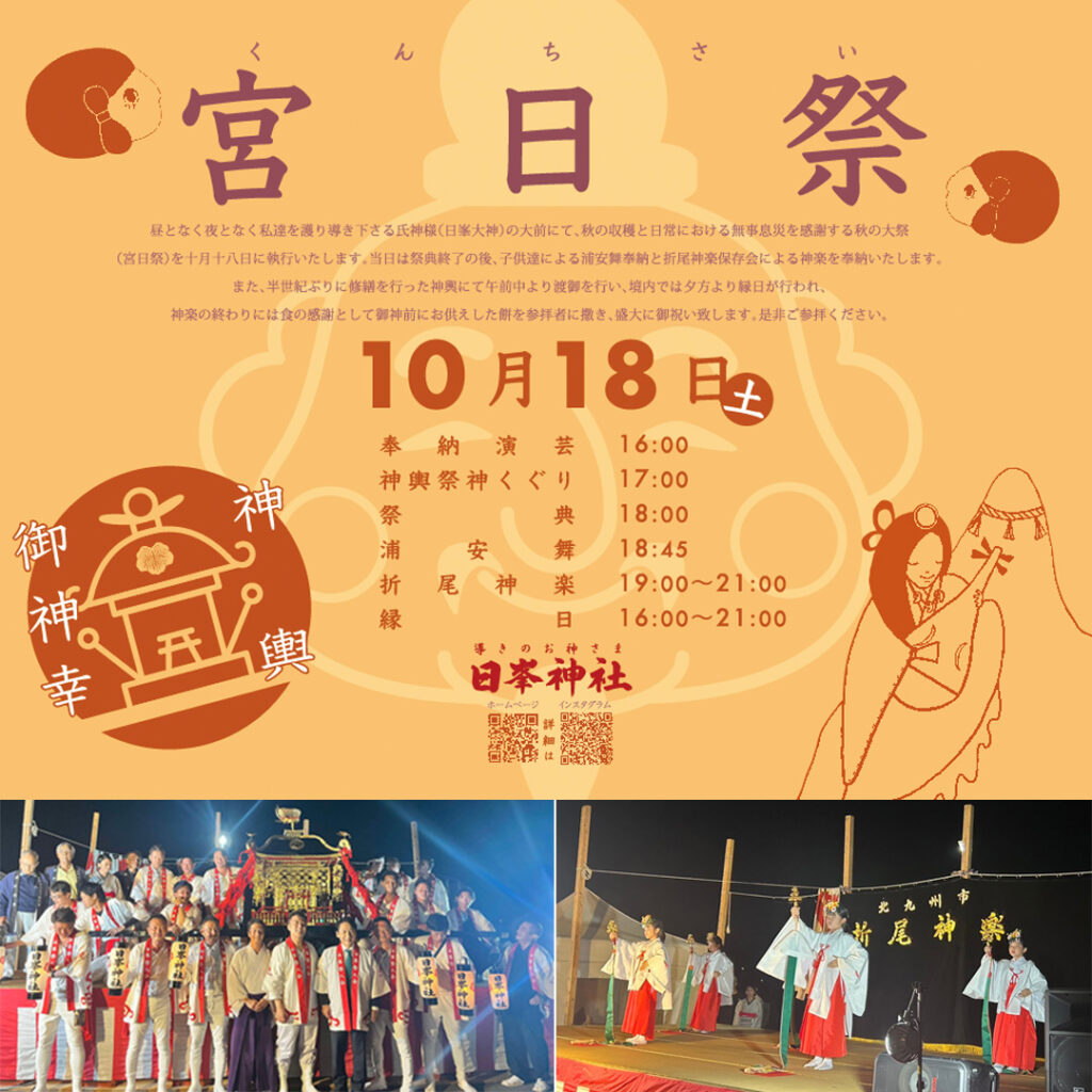 当日、境内では縁日を開催し、境内では神輿をくぐる『日峯祭神くぐり』、祭典終了の後は子供達による浦安舞奉納と折尾神楽保存会による折尾神楽を奉納いたします。