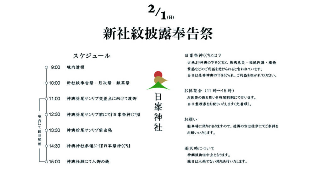 ・神輿渡御ルート:神社〜竹藩〜ハローデイ共立前店〜セブンイレブン共立大前店〜サンリブ折尾店(日峯祭神くぐり:12時30分)〜浅川郵便局前〜神社(日峯祭神くぐり:14時30分)