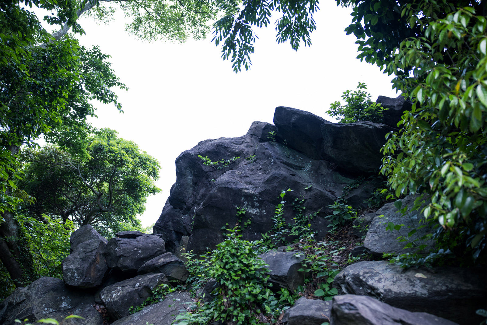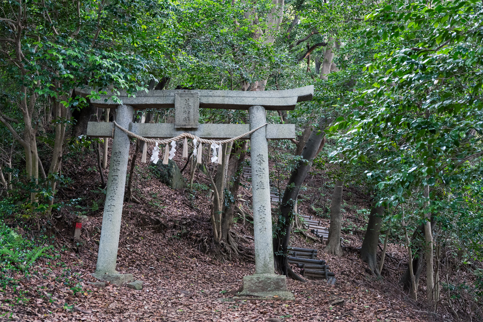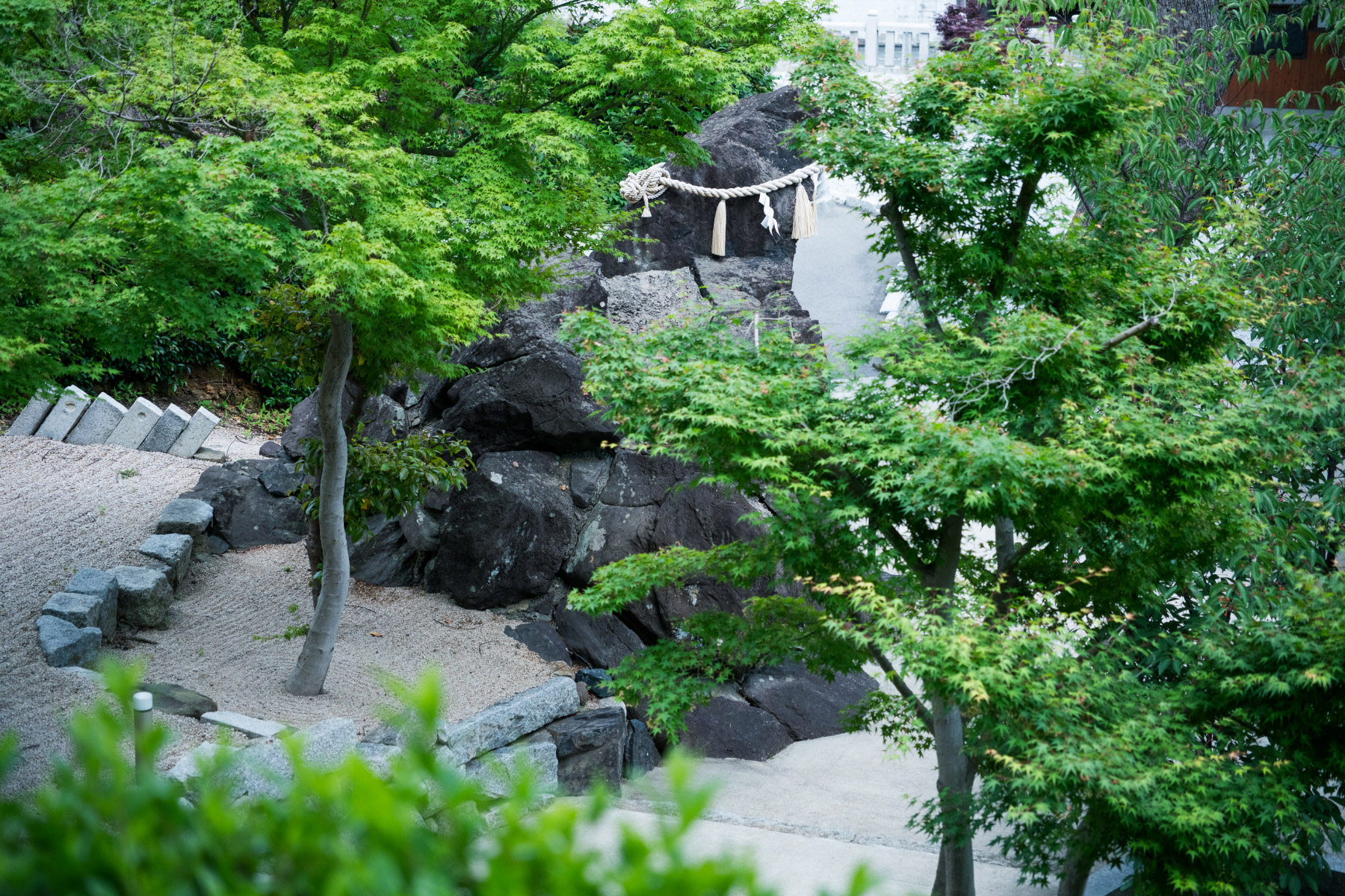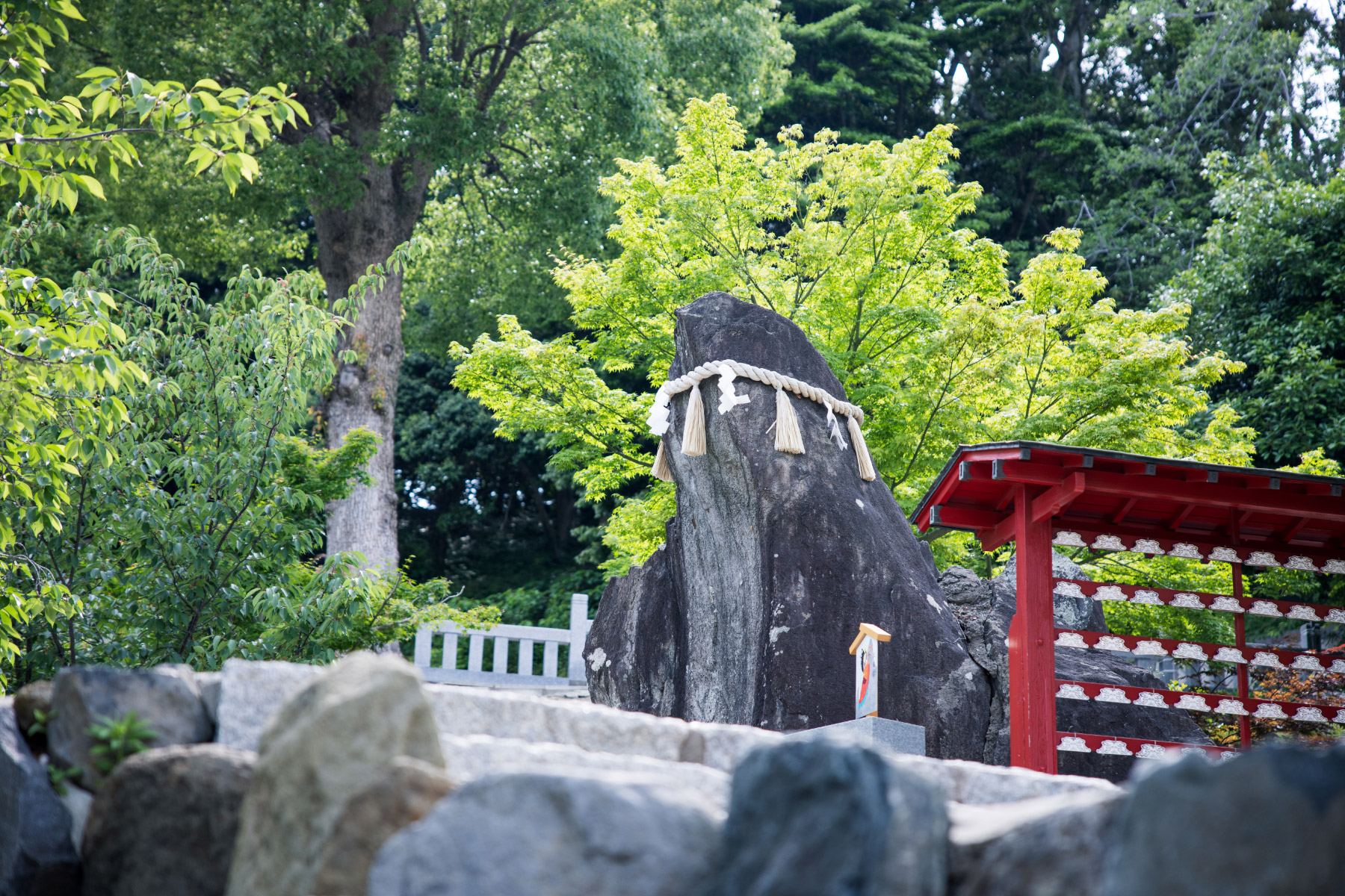 山の頂上付近に鎮座する3つの岩(琵琶岩・上臈岩・国見岩)のうち、東南に鎮座していた上臈岩は、日峯配水池築造のため、昭和55(西暦1980)年2月23日、今の境内地に祭祀いたしました。上宮と下宮は山続きで繋がっていましたが、市の宅地開発により分断され、現在は上宮への参道入口が別の場所となっています。